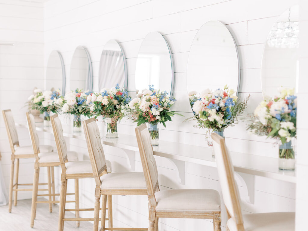 Designed with comfort and light in mind, the Bridal Suite is a private haven for you and your wedding party. Enjoy individual makeup chairs with smart mirrors, a full-length antique mirror (perfect for those getting ready photos), cushioned benches, and a private restroom. Its front-corner location offers quick access to the Grand Hall’s entrance for that perfect ceremony entrance.