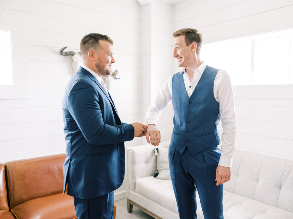 The Groom’s Suite is both stylish and functional, featuring plush seating, a high-top bar, full-length mirror, private restroom, and a flat-screen smart TV. Whether it’s watching the game or relaxing with the wedding party, it’s a space designed for ease and enjoyment.