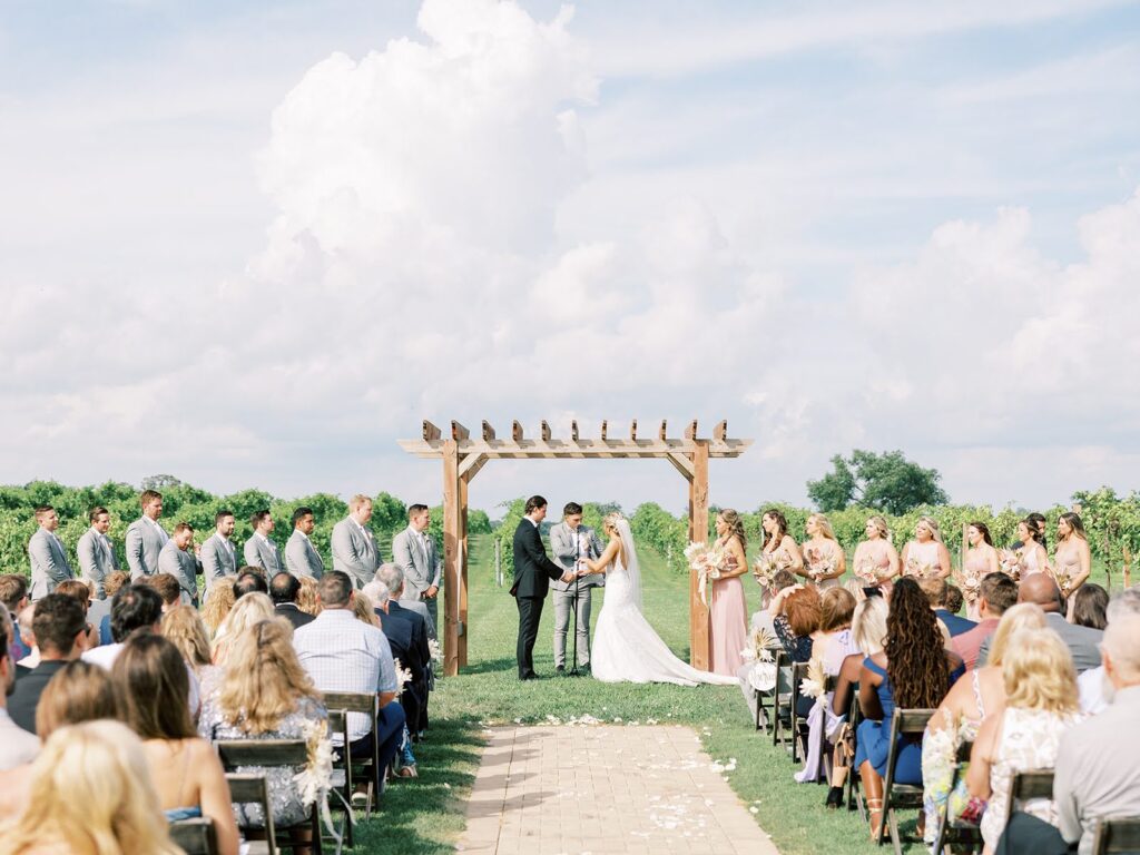 Located just beyond the Grand Hall and framed by our vineyard, the Arbor is a serene and romantic outdoor ceremony option. While it doesn’t have electricity, it’s a popular choice for acoustic musicians or DJs who can provide a discreet power source. Visible from the patio and indoor space, the Arbor creates a timeless backdrop for your vows.