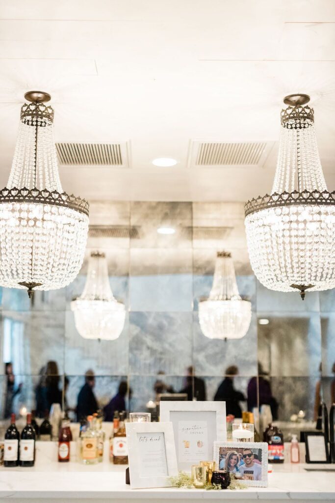 Cheers to flexibility! We offer one large stationary bar with antique glass and chandeliers, perfect for cocktail hour in the foyer. For outdoor celebrations, we also provide two mobile white shiplap bars that can be positioned on the patio.