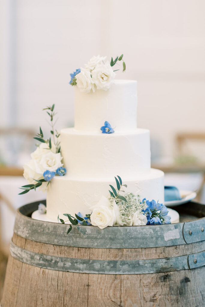 They had a beautiful  “King’s Table” in the center of the room that acted as their head table, while the remaining guests were seated at rounds.  This not only created a focal point, but also had a bit of a dinner party vibe, which was perfect for their guest list. Their three tier white wedding cake accented with fresh florals rested beautifully on one of our wine barrel accent tables.